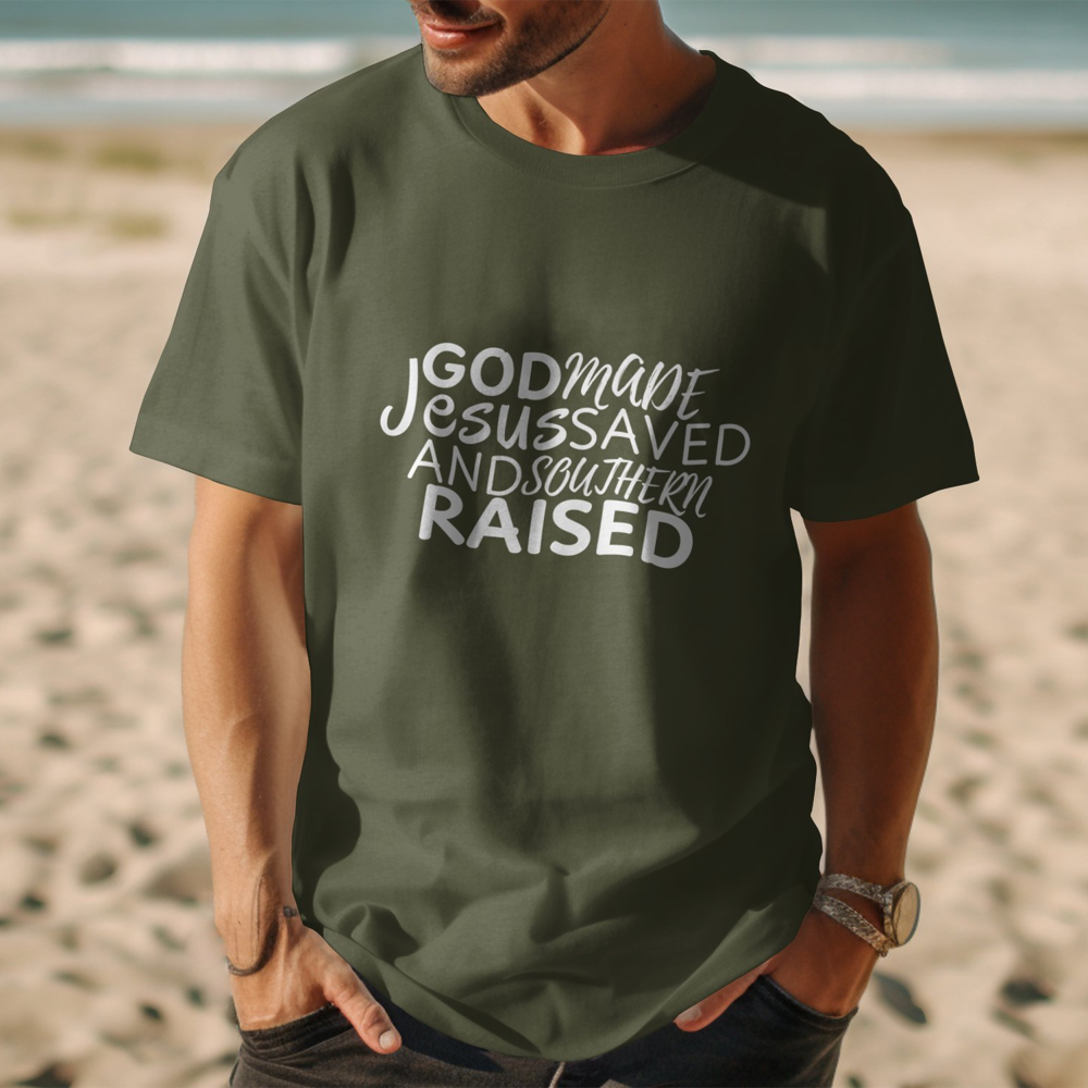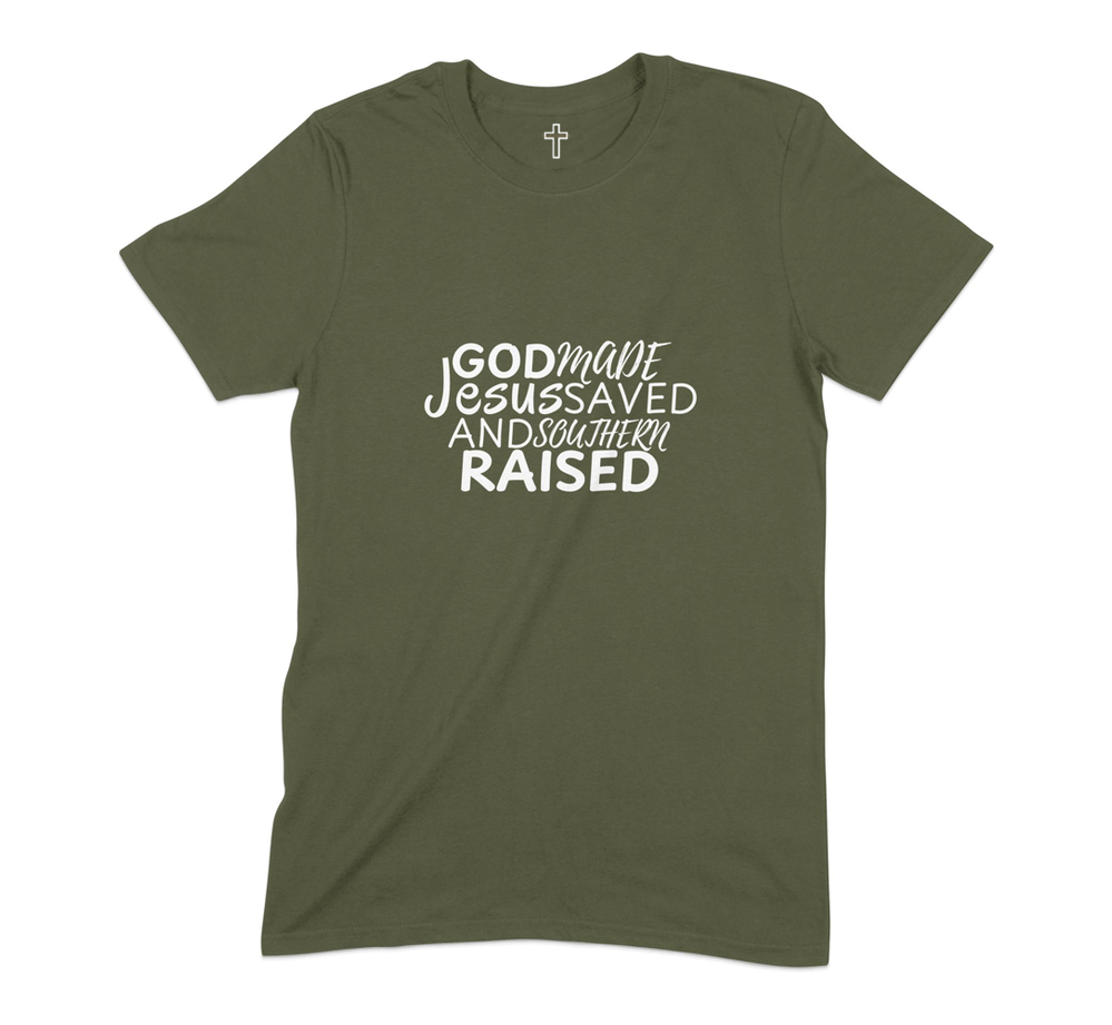 A bold reminder of your faith and Southern roots—God made you, Jesus saved you, and the South raised you!QUALITY & FIT